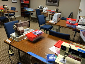 Each day the workrooms started out sort of like the picture at left. We had lots of borrowed sewing machines and kits for everyone.